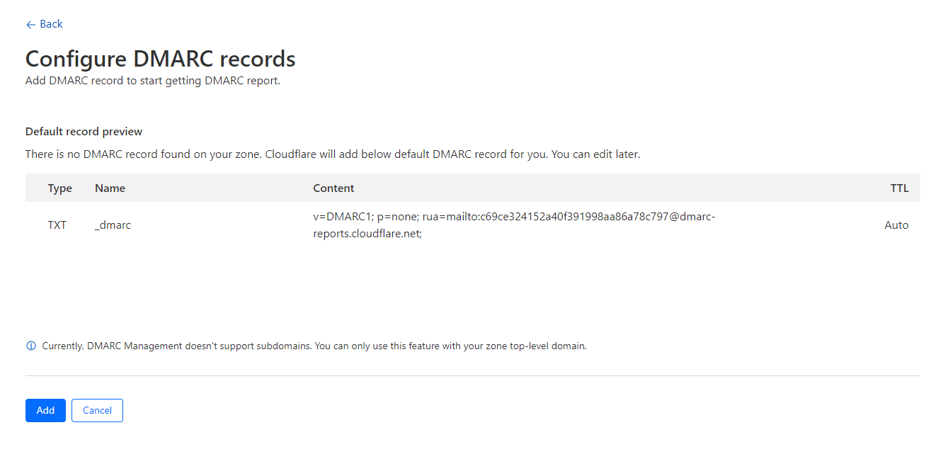 - On the Configure DMARC records screen, click Add