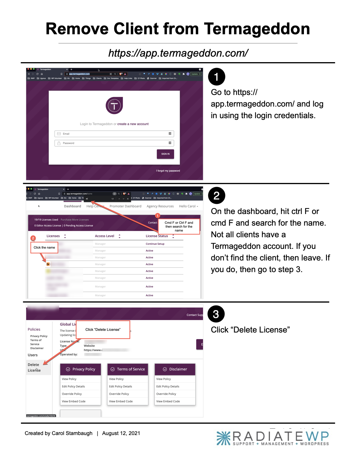 Remove Client from Termageddon https://app.termageddon.com Tags Cancellation, Clients, Processes, Staff Training Doc navigation← Google to Fathom Analtyics TransitionSetup Private Pages on Website → How can we help? Name Email Subject Message