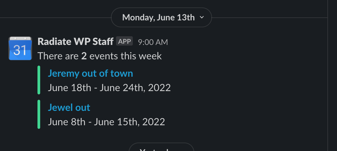 - Now that the event is on the staff calendar, Slack will remind us the week that you are scheduled to be out.