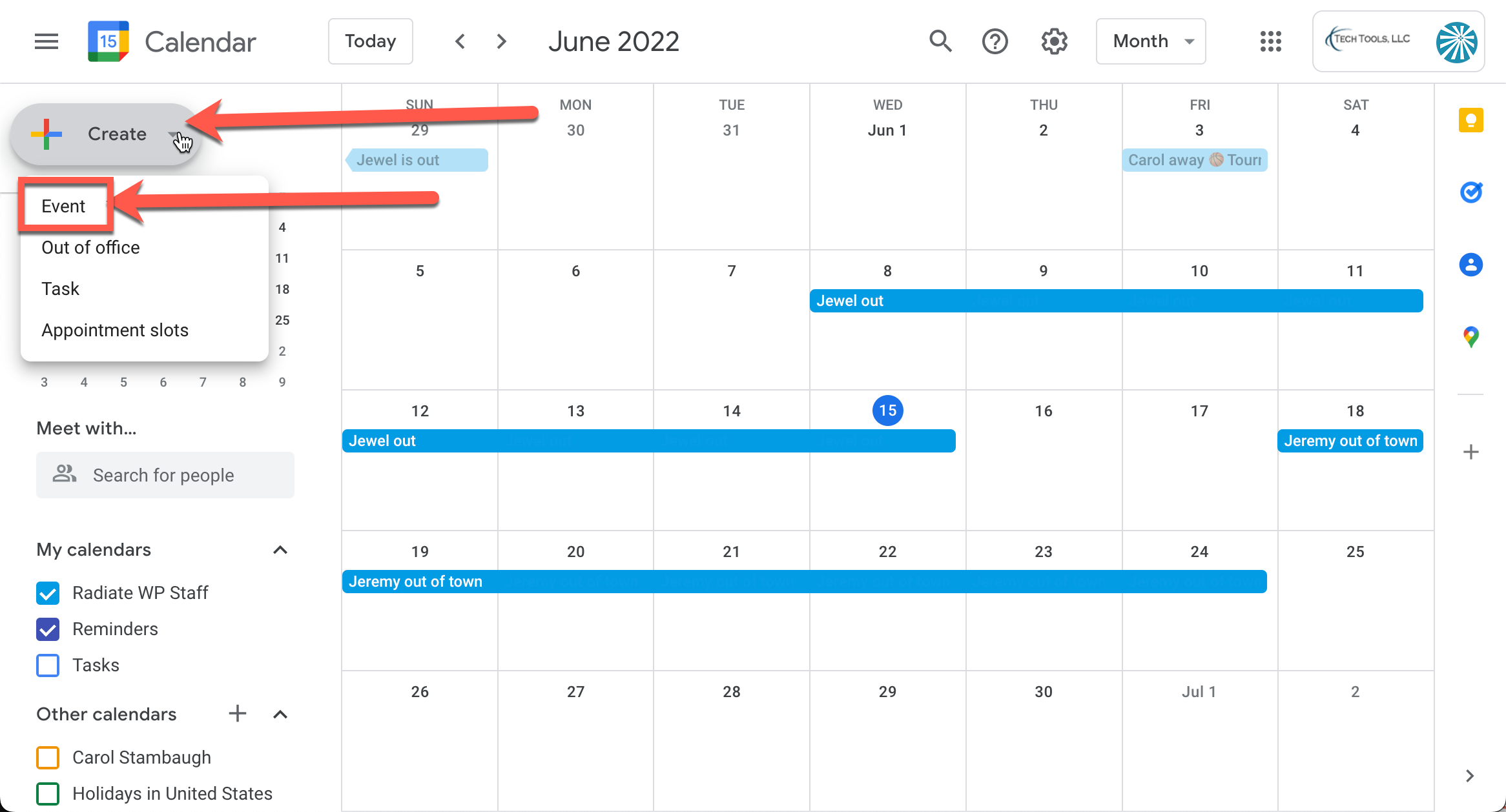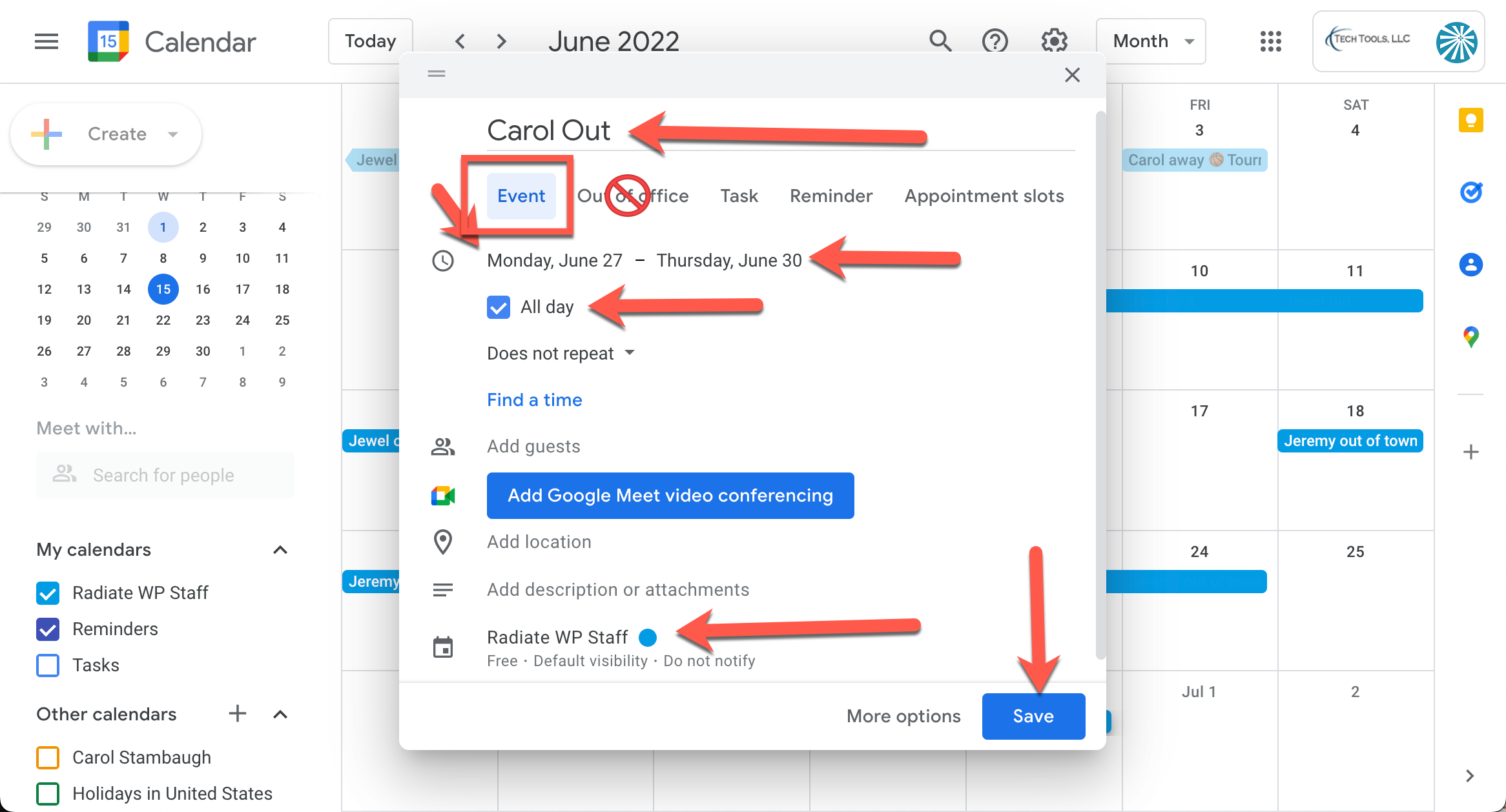 - Double-check to make sure this is being added to the Radiate WP Staff calendar and not another calendar.